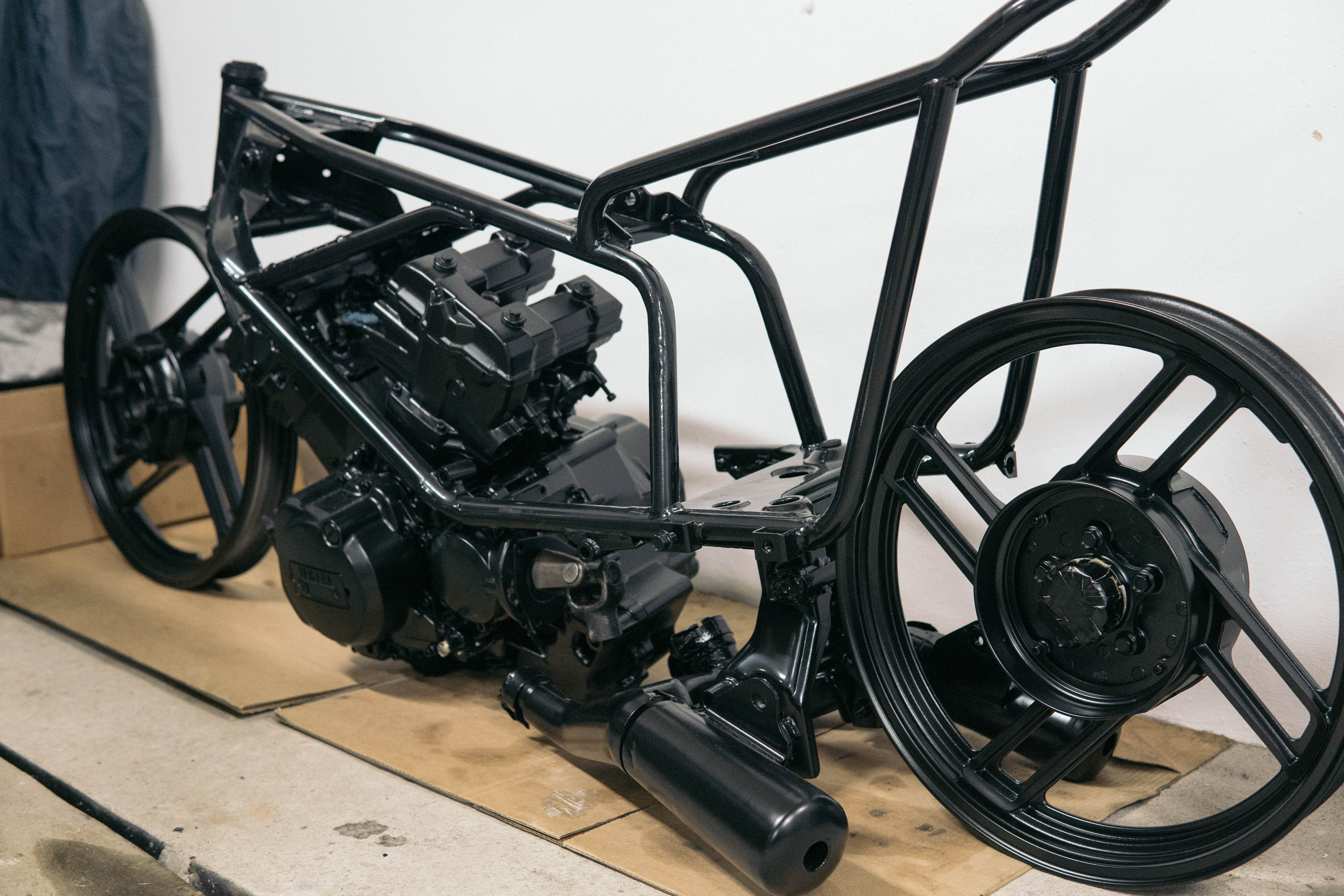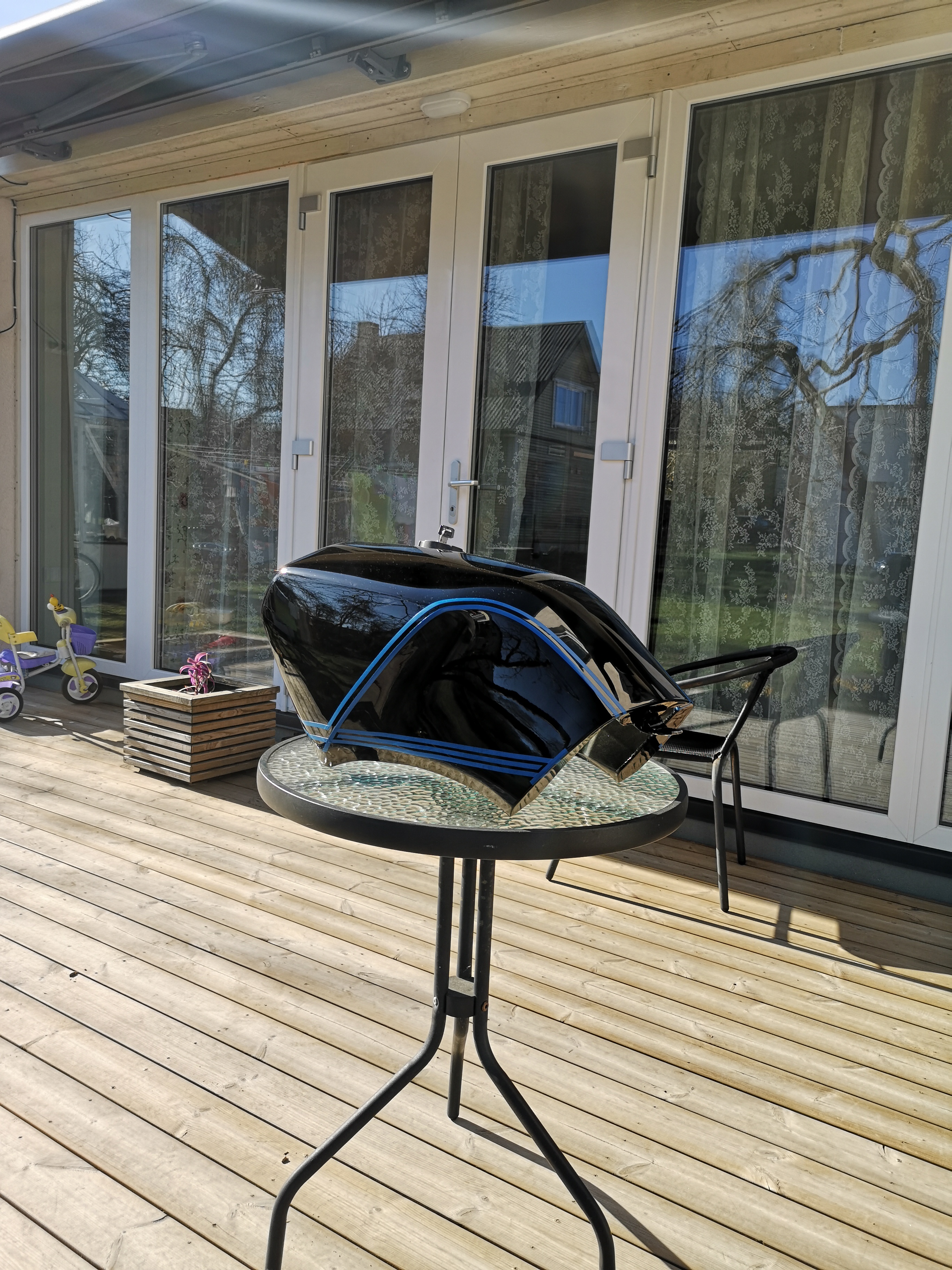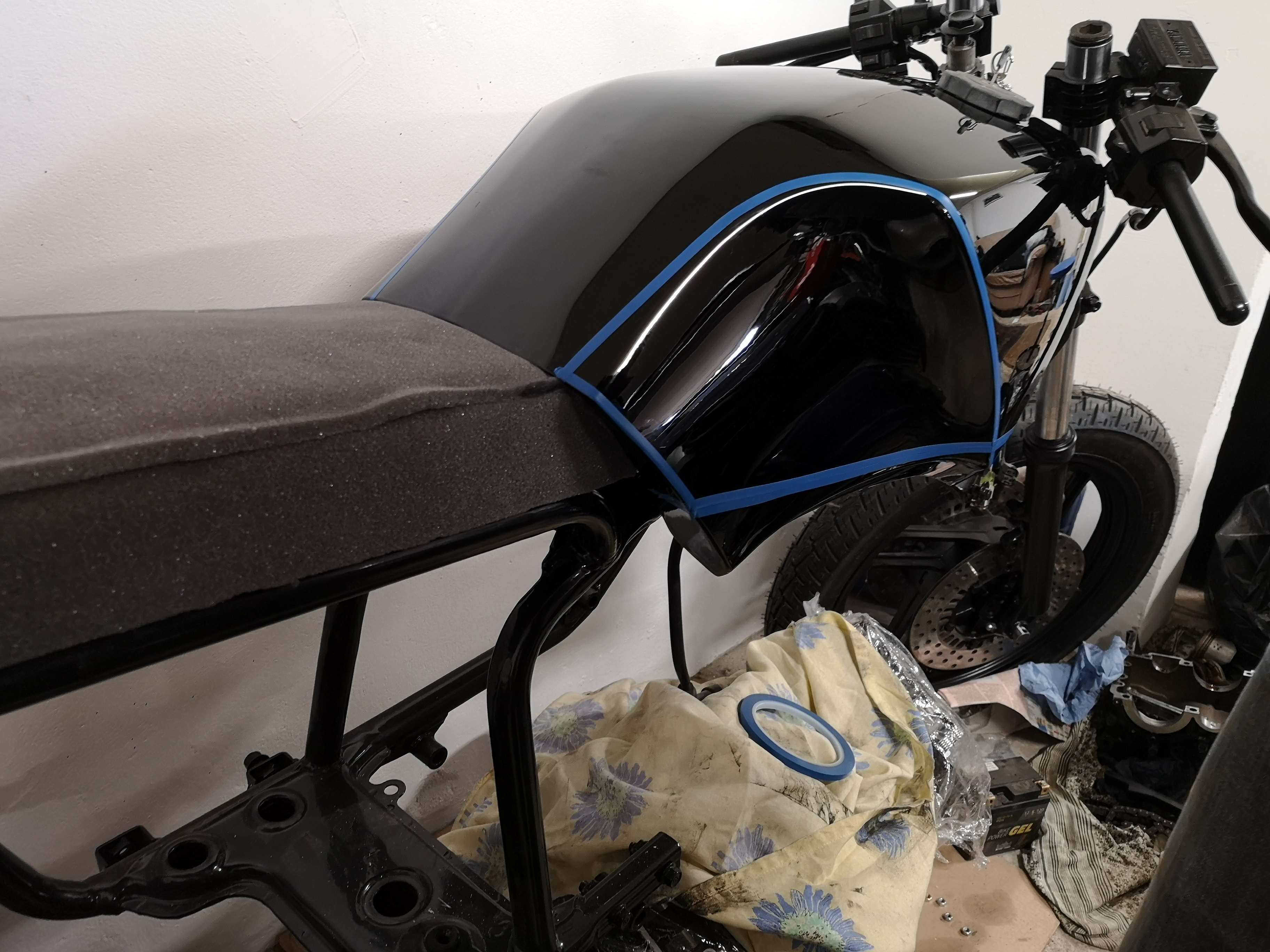 Et natukene visuaalset caferaceri joont tekitada, siis tagaraamiga samale joonele (justkui tagaraami pikenduseks paagile) tahan teha mattmusta joont.