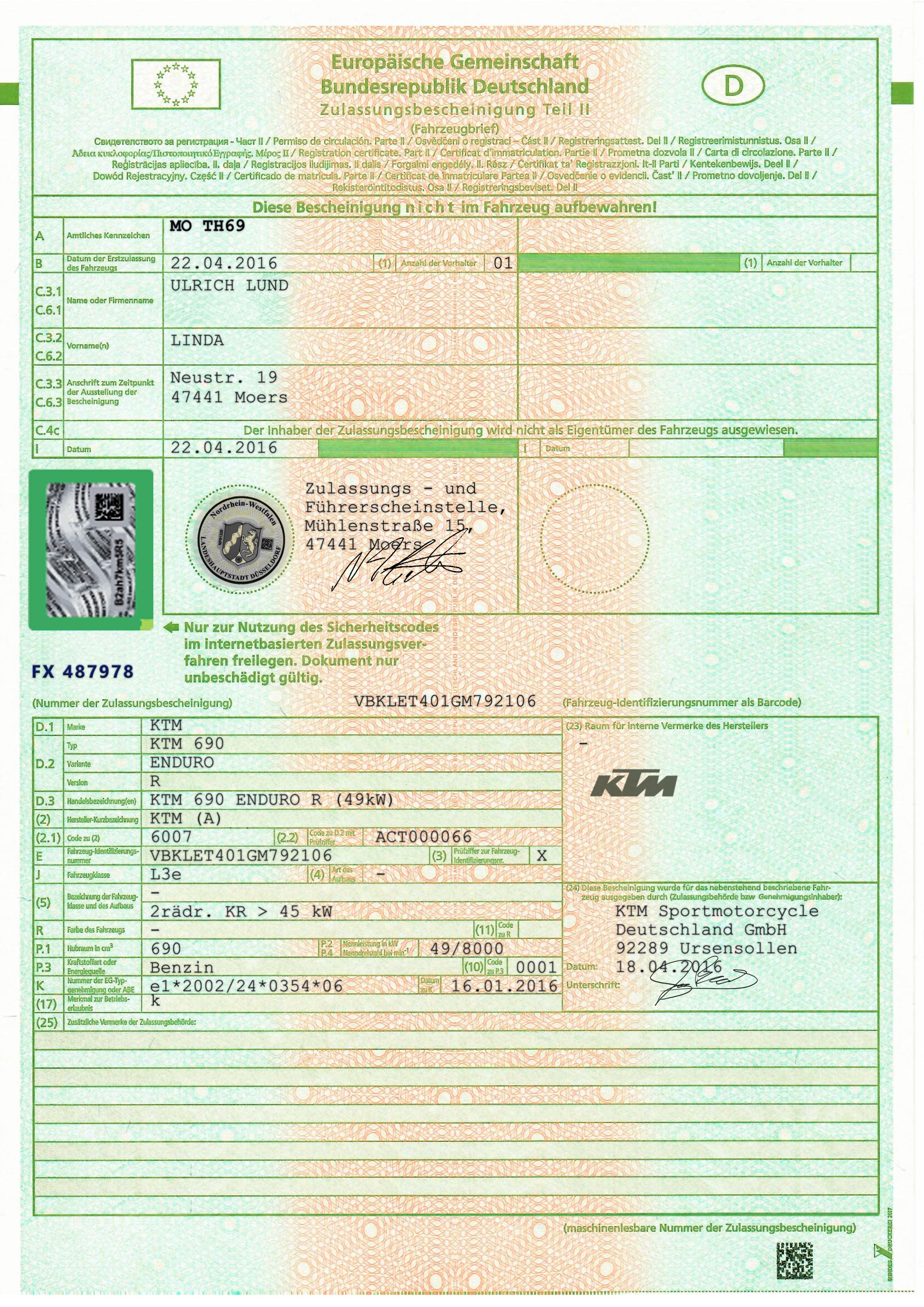 Epiloog: minu jaoks kõige kurvem ja keerulisem ülesanne on praegu (ma tegelen sellest vist iga teine päev) on võltside „Zulassungsbescheinigung (vanasti „Brief“) kasutatav tegelased välja praakida. Saksast liiguvad mittu tuhat varastatud blankettid – aga õnneks kasutavad pettid neid blankettid pigem Porsche, kallis BMW´d ja Mercu´de müügiks, mitte aga tsiklide valdkonnast.