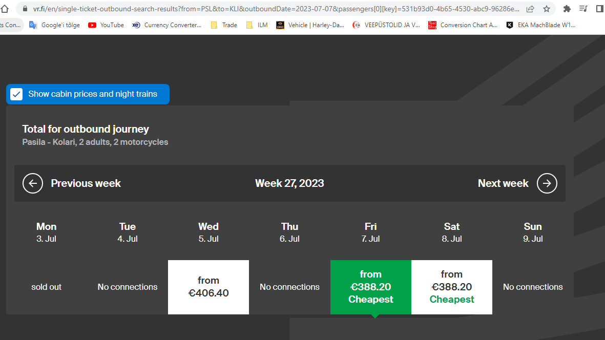233€ läks kokku kupee vooditega+ 2 mootorratast. See teeb siis 117€ nägu 900km eest, lisaks öömaja selle hinna sees.