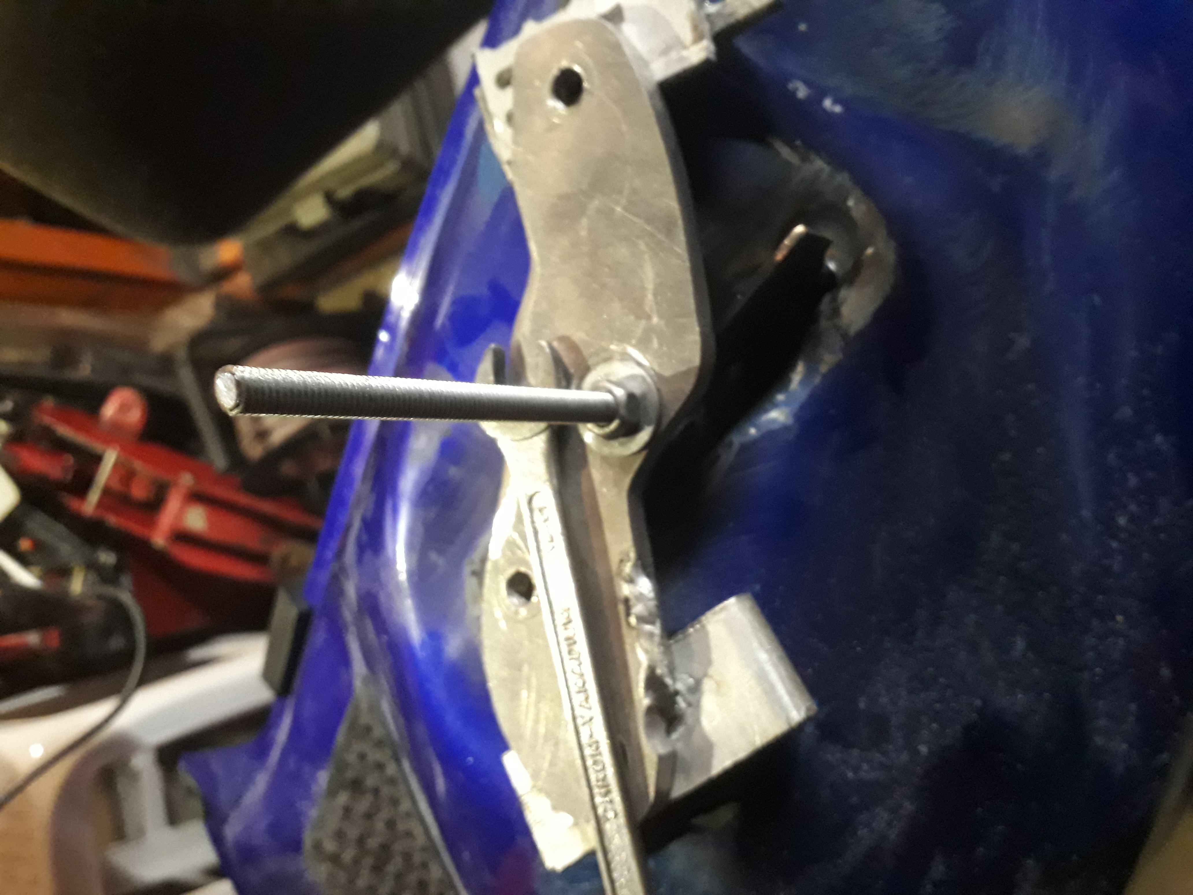Paagimaterjal on kõrge süsinikusisaldusega teras, mistõttu on seda keevitada laias laastus täitsa s*tt! Tungsten kogus esimestel proovikoha peal tehtud katsetel praktiliselt hetkega suure "mulli" otsa, keevitus pritsis ja metall sulas üsna kontrollimatult. Keevitamise seal kus vaja tegi veelgi raskemaks see, et igalpool ei mahtunud elektrood piisavalt sügavale keevituskoha juurde. Hirmsuurt stick-outi ei tahtnud ka seada. Mingi fancy over-sized läbipaistev gas lens oleks siin ilmselt abiks olnud. Sellegipoolest sai pulsireziimis sulatades õige koha peale vajalikud instrumendid ikkagi pleki külge ja õnnestus ka mõlke välja sikutada. Kõige jõhkrama mõlgi puhul osutus nõrgimaks lüliks hoopis alu "tugitala", mis on 8mm paksusest materjalist ja üsna laiast latist.