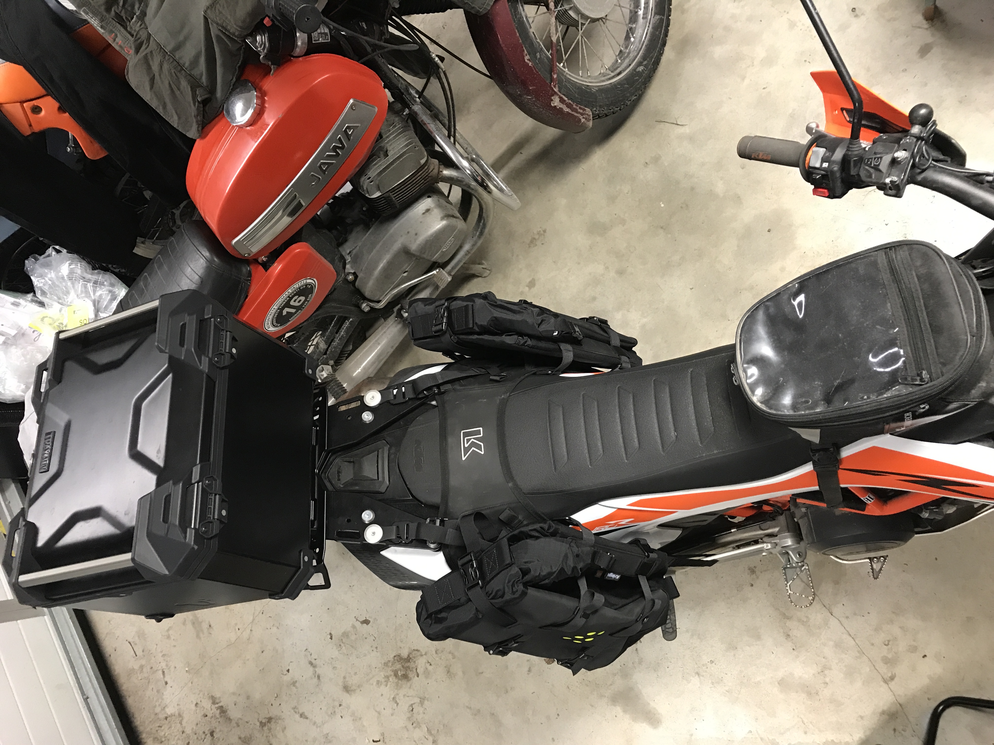 1. Enduurosõidul kindlasti kotid aga tööl- ja teatriskäiguks võiks siiski üks topcase olemas olla (mugavam asju sisse visata ja maanteel/kruusal pole kaal probleemiks).