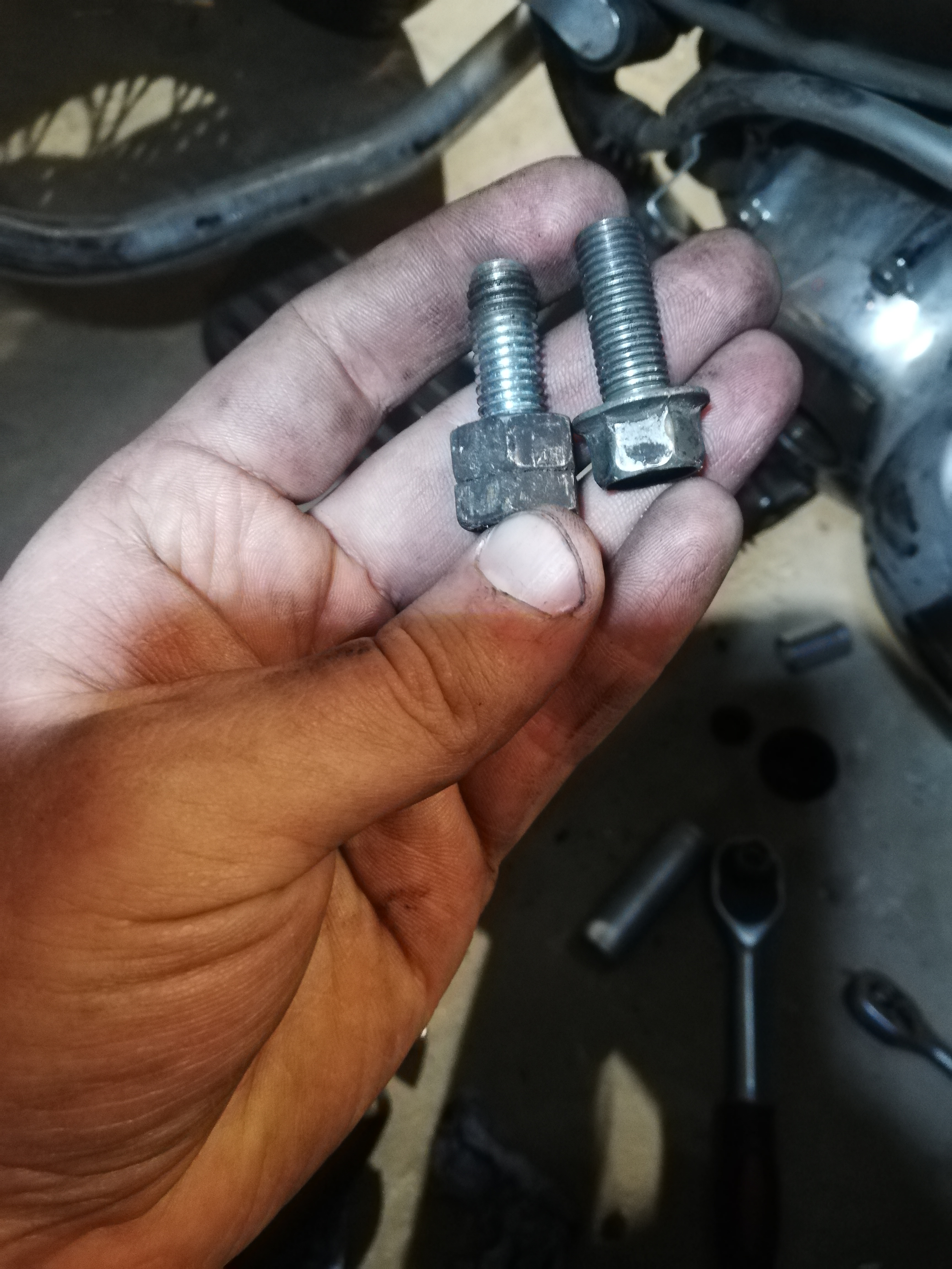 Originaal polt on siin pildil paremal. Manual näeb ette, et jalaraud keeratakse kinni 48Nm. Müstika. kuidas inimesed ei mõtle. Mis juhtub kui rakendada sama jõudu asenduspoltide puhul? Täpselt sama, mis klapikambri poldiga, rikub keerme.