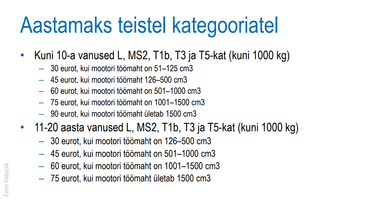 Siit tekkis veel üks küsimus, kas üle 10 aasta vanustel 125cc mootorratastel kaob siis maks ära?MannyEric kirjutas: ↑09 Okt 2023, 15:03Maksumäärad on paigas. Tsiklitel tuleb alloleva tabeli alusel ja registreerimismaksu pole