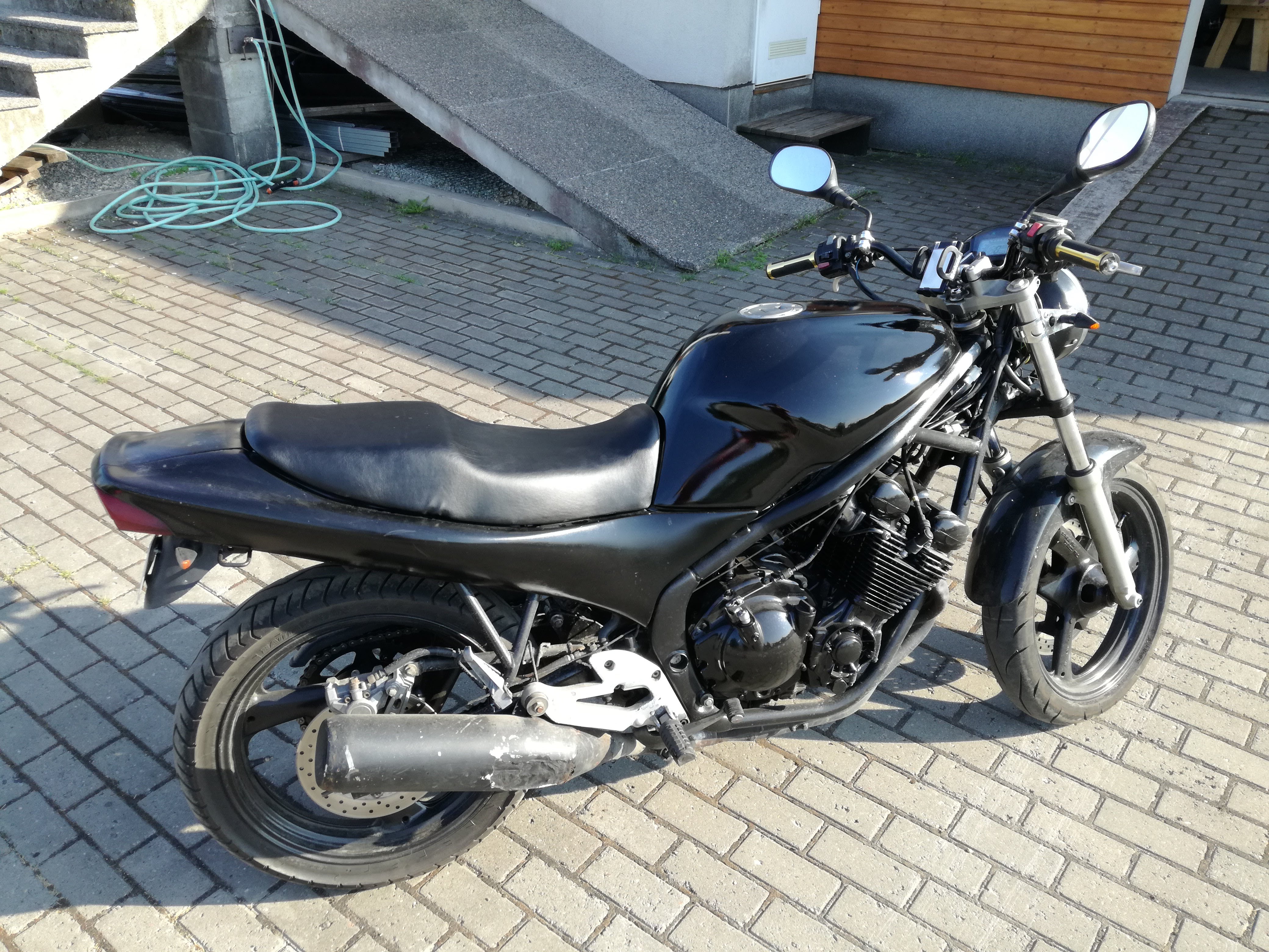 Teiseks lenks/armatuur/esiplastik peaksid mingi hetk leidma oma välimuse ja oma koha. Tuleks värvida mõned detailid ja poldid vahetada roostevabade vastu. Mõnede erinevate peeglitega tegin proove. Hetke parim lahendus pildil bar-end peeglitega, nähtavus väga hea (loe: näeb ka palju muud kui küünarnukki).