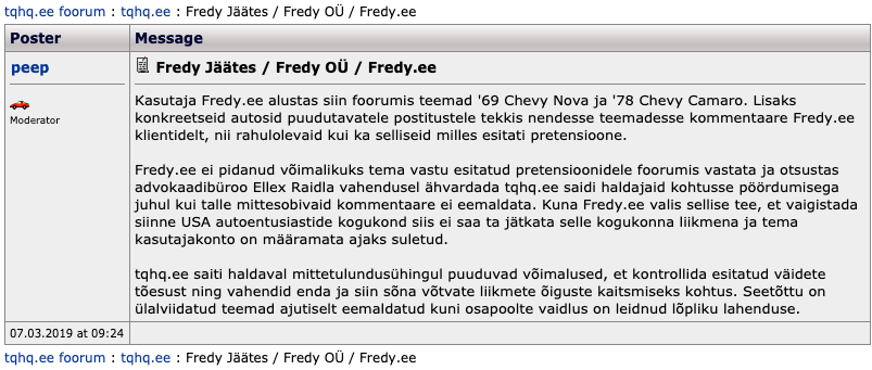 • Fredy advokaat saatis meile kaks päeva hiljem kirja nõudega eemaldada kõneks olnud teemad hiljemalt reedeks vastasel juhul läheb ta foorumi juhtfiguuride vastu kohtusse (vt. allpool);